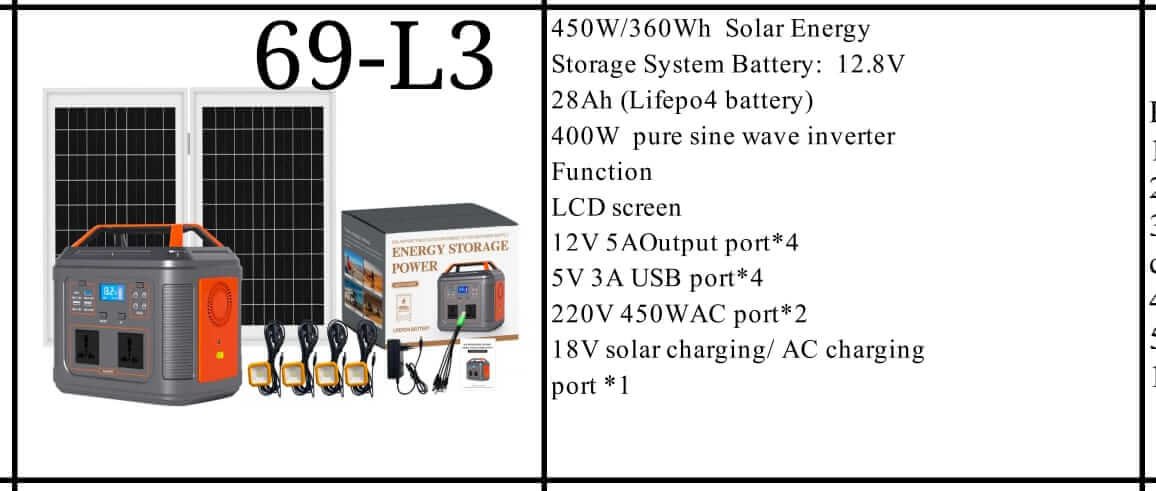 The 450W Solar Energy Power Storage + 100W Panel & 4 Bulbs is a powerful, energy-efficient solar power storage kit designed for small homes. With a 450W solar power capacity, it offers reliable power, while the 100W solar panel ensures efficient charging. The kit includes 4 energy-efficient bulbs, making it a versatile choice for all your solar power needs.